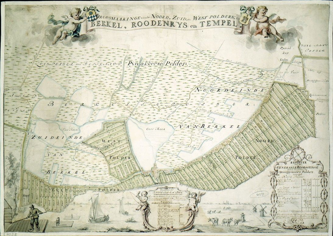 The 1712 map on the right (click to enlarge) shows Delft at the top and the two small lakes at the bottom. It is a detail from the wallmap Het Hoogeheemraedschap van Delflant by Nicolaes Krukius (1678-1754), also Nicolaas (Klaas) Kruik or the Latinized Nicolaus Samuelis Cruquius. At the time, mapmakers did not practice the convention of north at top. The Schie canal runs south out of Delft toward Rotterdam. In the bottom left corner of the map is the hamlet of Zweth. There, the Berklse Zweth runs east straight between the polders to the two lakes.