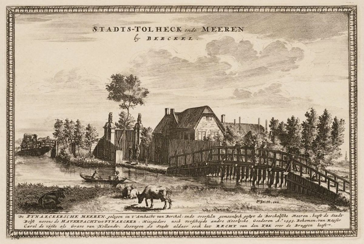 In almost the center of the image below, the western neck of the Oostmeer crosses the road from Delft and Pijnaker to the north and Rotterdam to the south. At that crossing is a bridge and toll gate, shown on the right sidebar in a detail from the 1678 Kaart Figuratief (click to enlarge). The caption states that the right of the Berkel shire (ambacht; smallest rural administrative unit) to collect tolls was granted by Holy Roman Emperor Charles V in 1555.