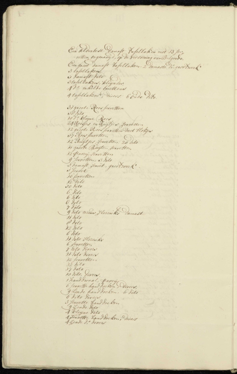 | 4 large nosecloths (neusdoeken) | 4 small damask feijteltjes | 12 ditto: 11 ditto |