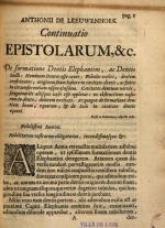 These eight consecutive letters were the longest batch Leeuwenhoek published up to this point. They were all addressed to the Royal Society. The volume must have been popular. It was bundled with other volumes and was reprinted four times, in 1696 as an Editio altera, in 1715 as a second edition, and in 1730 as the Editio tertio. Each used a different typesetting.