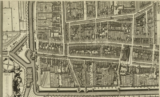 This book analyzes the huge wall map section by section. Above is the northwest quadrant, which includes Leeuwenhoek's neighborhood middle right.