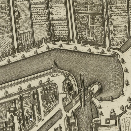 Thonis Philips bequeathed these properties to his son and Antony's uncle Huijch Thonis Leeuwenhoek (-1669) in his will of April 2, 1643 (notary: Guilliaume de Graeff) – (alhier vertoont op June 13, 1668)? From the illustrations on the map, this property was a large cabbage garden (Coolthuijn) with a small gate house, perhaps tool shed?