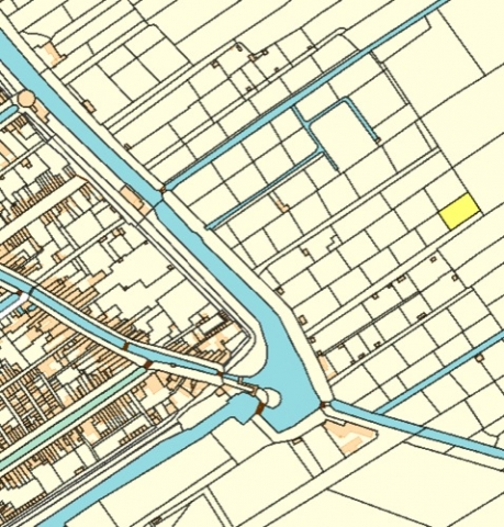 On the map below, it's the long rectangle in the center with a sloot on all sides. On the left looks like a dike or path. The end closest to the singel has a gate that has a little house attached to it and another little house just to the left of it.