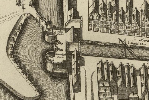 The Kaart Figuratief of 1678 shows a straighter land bridge as well as canons on the deck over the gate. Inside the gate, the northern terminus of the Oude Delft gracht, is the Leydse Veer, the Leiden ferry, which had scheduled runs after 1638.