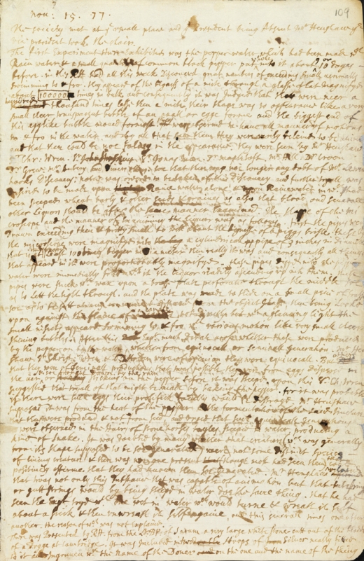 The image below is the folio page from the minutes for that November 15, 1677, meeting that Hooke took as the Society's secretary. The transcription below was copy-edited by me for clarity.