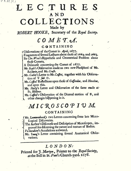 Over the next six months, Hooke would continue his investigations, including letters from and a detailed response to Leeuwenhoek, in Microscopium, the second part of his book Lectures and Collections (title page left), published in 1678. Leeuwenhoek's contribution was titled "Two Letters concerning some late Microscopical Discoveries". Hooke's response was titled "The Author's Discourse and Description of Microscopes, improved for discerning the nature and texture of Bodies".
