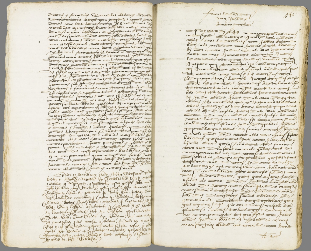 The orphan masters first took notice of the van Helden family when Frans Leenderts died in 1649. His estate inventory was filed then with the Weeskamer, now preserved as inv. 4537 Aantekeningen betreffende uitgaven voor de boedel van Frans Leendertsz. van Helden, gehuwd met Grietgen Jansdr Cool (Notes concerning expenses for the estate of Frans Leendertsz. van Helden, married to Grietgen Jansdr Cool). The orphan masters entered the details on page 141 of their register (right; click to enlarge). It noted two piece of property: