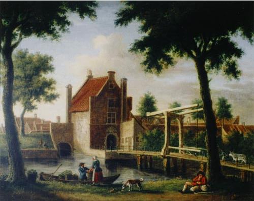 Blaeu's 1649 Delft Batavorum map (right) shows a small round tower to the south of the bridge where the gracht meets the singel. on the Kaart Figuratief, made thirty years later, the round tower is gone and a small house tops the land gate, owned by the city. This house was more for the gatekeeper who raised and lowered the drawbridge than it was for military defense. From 1694 to her death in 1733, the gatekeeper was Maria van der Hiel, wife of surgeon Johannes de Kets.