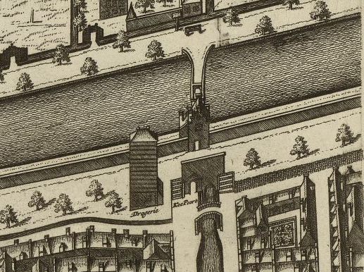Many images of the Koepoort show a tall building next to it. On the Kaart Figuratief of 1678 (right), it is just to the north of the bridge, with the label Drogerie. The building was the city drying shed (stadsdrogerij), used in rainy weather for keeping dry sheets of fabric of the kind Leeuwenhoek sold in his store.