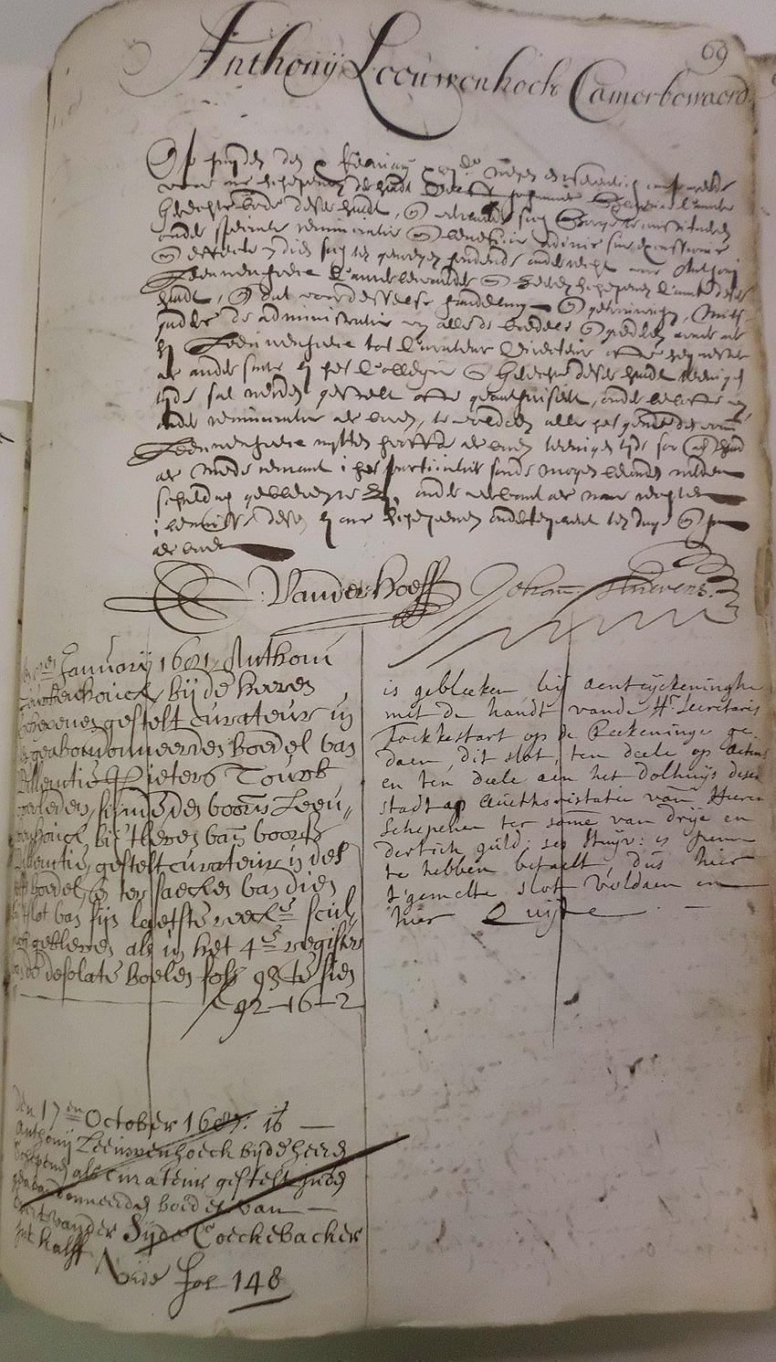 In the Register van de Curateelen, Leeuwenhoek has two pages, sharing the second with his cousin Lambrecht's son and notary Adriaan Leeuwenhoek, whose page had filled. On the left is page 69 (click to enlarge) showing Leeuwenhoek's appointment to the Touw and Van der Sijde estates.