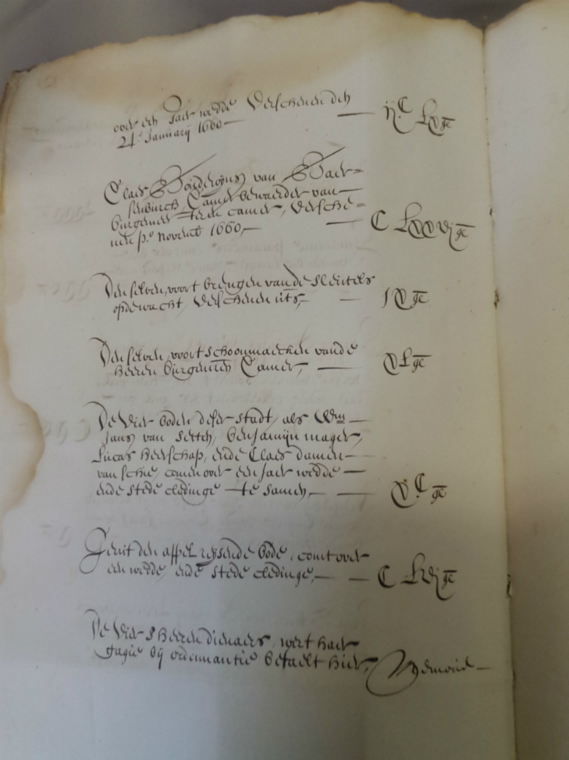 In 1660, the year Leeuwenhoek began his long career as camerbewaarder of the magistrates' chamber, Andries van der Goes was treasurer. In that year's Rekeningen van de thesaurier, his account books (cover on the right; click to enlarge), the messengers are listed with the camerbewaarders after the city managers, doctors, and surgeons, but before the clergymen and other church workers such as the organists.