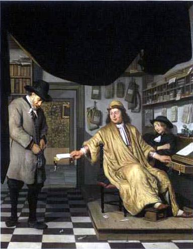 The oil on the right was painted by Job Adriaensz. Berckheyde in 1672. When people wanted to settle disputes or make agreements, they turned to a notary. The notaries had clerks, who often did the actual writing. Some transactions required witnesses, such as two magistrates (schepenen). Thus, Delft's notary archives are among the best places to learn what life in Leeuwenhoek's time was like.