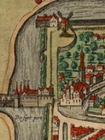 The map of 1560 (upper right) is a view from the east that shows a single gate and the Schie canal beginning east of the gate. It was referred to as the Wittenvrouwenpoort for the nearby nunnery. Construction began in 1396 and was not completed until 1514.