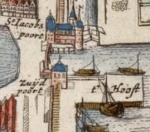That meant ship traffic, lots of it. By 1614, Delft's business community and its city government began digging out the Kolk, the little open area of water in the foreground of Vermeer's painting. Finished by 1620, it was seldom that empty. The Kaart Figuratief (lower right; click to enlarge) of 1678 shows it full of masted boats as well as passenger and cargo barges (trekschuiten). There was a ship-building and ship-repair area on the east bank of the Schie not shown here.