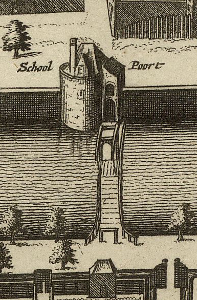 The Schoolpoort was between Waterslootse poort and the Haagpoort. It was named after the Latin School (expensive, for regent families) on the street that ran closest to it, Schoolstraat. It was a land-only gate. The image from 1816 seems to show a water gate, but the closest water on the city side is the Oude Delft gracht, over a hundred and fifty yards away.