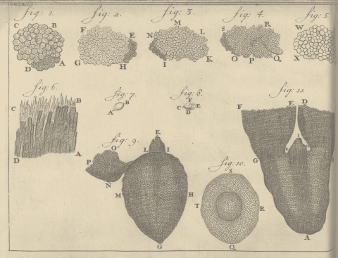 Figures 7 and 8: apple seed whole and apple seed with skin cut away, A and C being vessels for nourishment