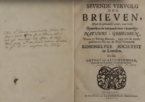 Similar to Sesde Vervolg. Note on blank page before the title page, in English (on right; click to enlarge): "This 3rd Volume immediately follows the Second part of the first Volume, and is not yet translated into Latin; So these three parts with the Second Volume of Letters to the R S compleat his Works." Since he did not publish more letters until 1718's Send-Brieven and the Latin translation of Sevende did not appear until 1719, this note must have been written between 1702 and 1718.