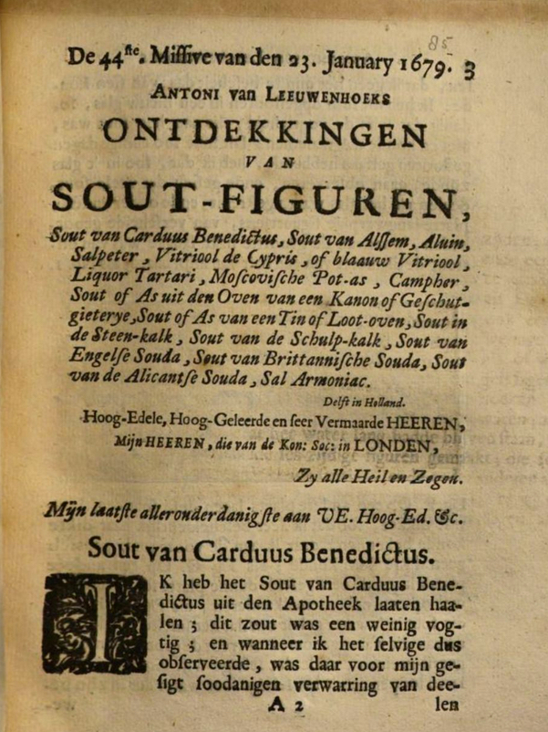 What Leeuwenhoek called sout-figuren, here translated "salt figures", we would today call salt crystals. At the time, crystal was not used in that manner. The translation of Leeuwenhoek's Letter 44 of January 23, 1685 in Philosophical Transactions: "An Abstract of a Letter from Mr. Leewenhoeck, to the R. S. Dated Jan. 23d, 1684/5; Concerning the the Various Figures of the Salts Contained in Several Substances".
