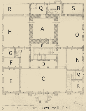 Art historian Kees Kaldenbach has a terrific web about Vermeer, who lived in Delft with Leeuwenhoek. Kaldenbach's page on the Stadhuis references A. de Groot's article "Het Stadhuis" in De Stad Delft, cultuur en maatschappij van 1572 tot 1667, which draws from van Bleyswyck's 1667 Beschryvinge der Stadt Delft. In Boitet's Beschryving, it begins in Chapter III on page 71, just before the lists of the members of the Veertigraad.