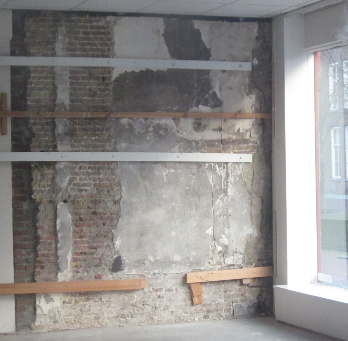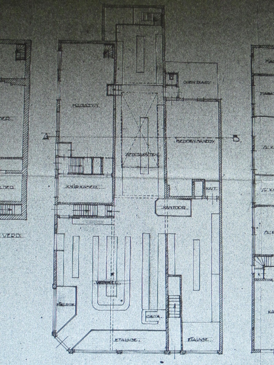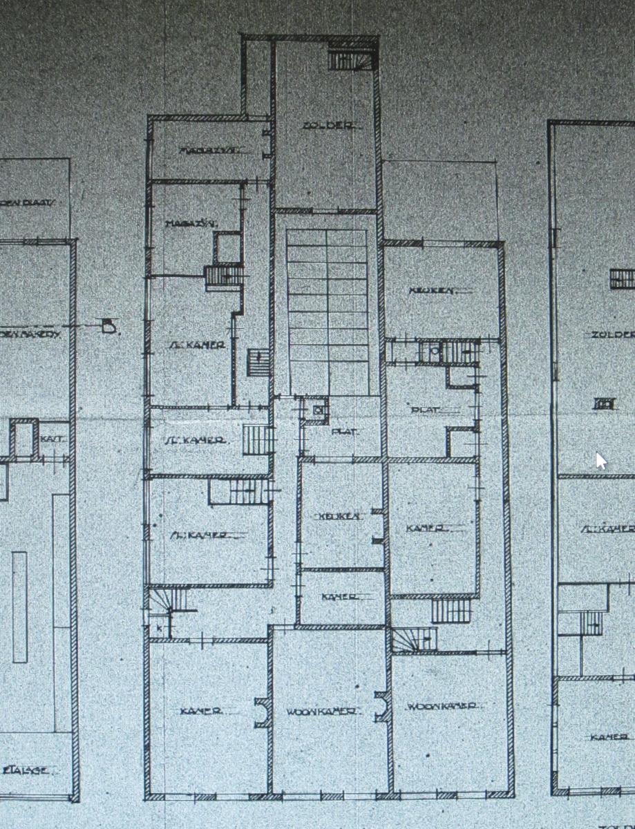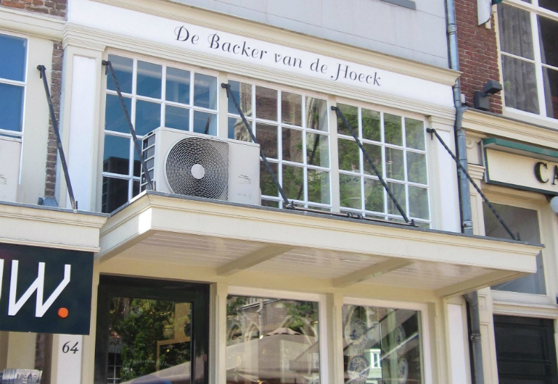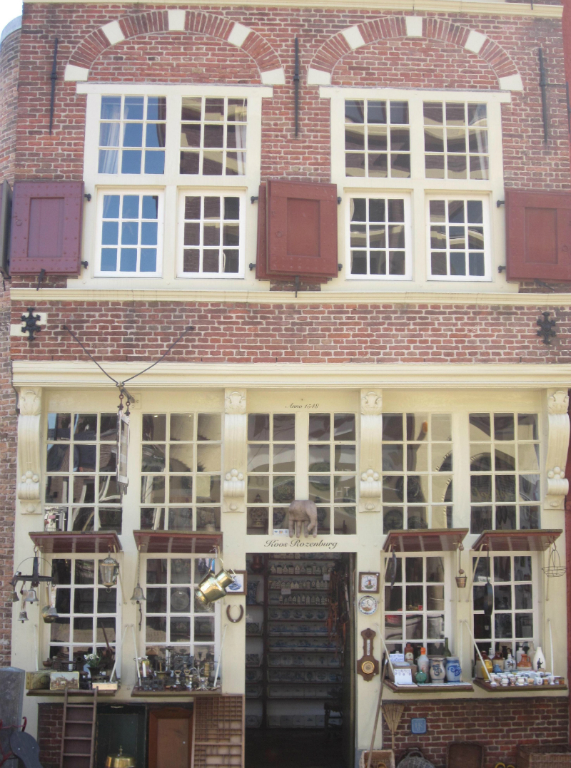 Running along the front of the house was a private stoop, a couple of inches high, that was covered by an overhanging ledge. The stoop was wide enough for a bench on which the shop's goods could be displayed. The windows had shutters over the lower half, but they could be opened to display more goods. As described In 1867 by G. D. J. Schotel,