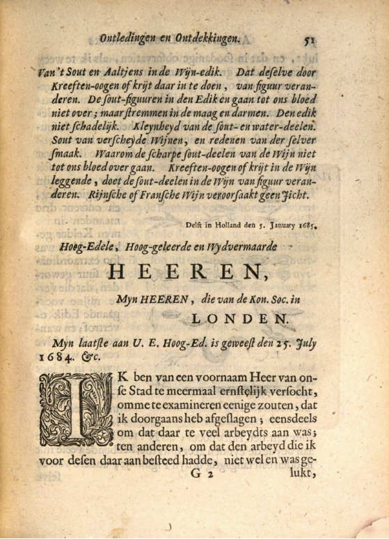 The 25 letters that Leeuwenhoek numbered and self-published from 1679 to 1687 (Period 2) have similar structure. On the right (click to enlarge) is the first page of the printed version of Letter 43 of January 5, 1685 (AB 82) to Members of the Royal Society. It was, as were all of Leeuwenhoek's self-published letters, preceded by a summary that was not in the manuscript and thus not in any of the volumes of Alle de Brieven / Collected Letters.