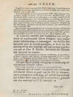 It also had a two-page dedication from the printer Daniel van Gaesbeeck to the reader (den Drukker aan den Leeser) dated July 24, 1684. On its second page (left sidebar; click to enlarge), it had summaries of the first three letters that Gaesbeeck printed but not the letter in Schobbens.