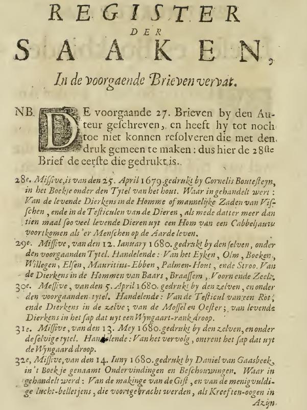 It had a five-page Register der Saaken in the voorgaende Brieven vervat (Index of Topics contained in the foregoing Letters) (left sidebar; click to enlarge), a list of all Leeuwenhoek's previously published letters from 28 to 52, with their dates, publishers, titles, and summary of contents but not the dates of publication.