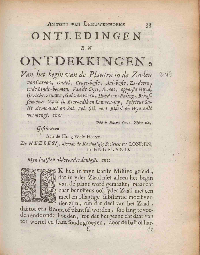Geschreven aan de Wijd-vermaarde Koninklijke Wetenschap-soekende Societeit tot Londen in Engeland.